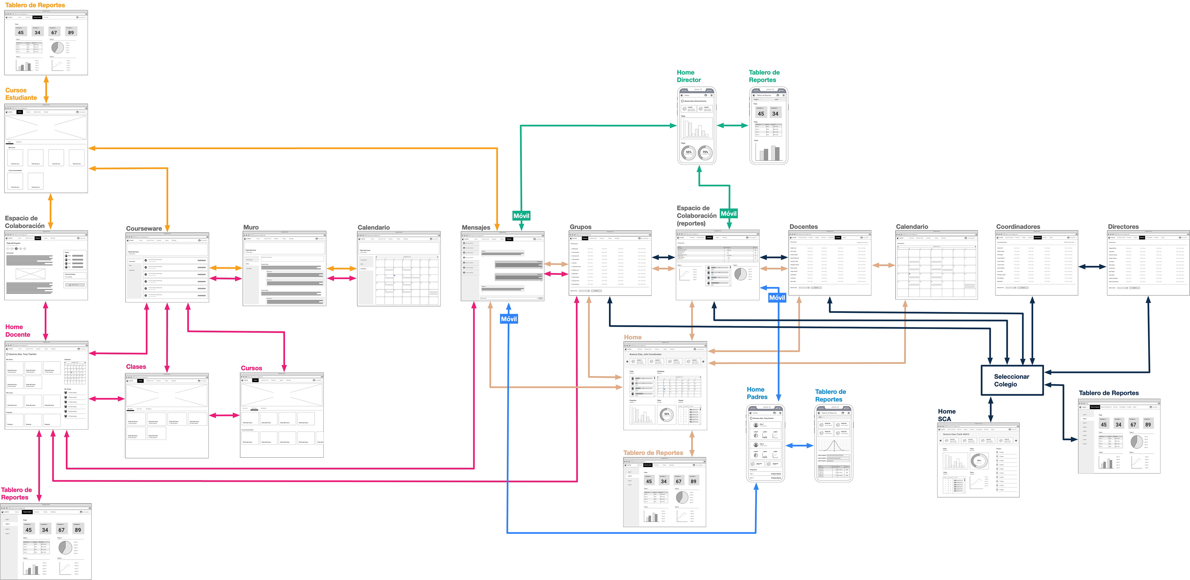 User flows were created to visualize the primary interactions, such as login, class enrollment, purchase, reports, etc.